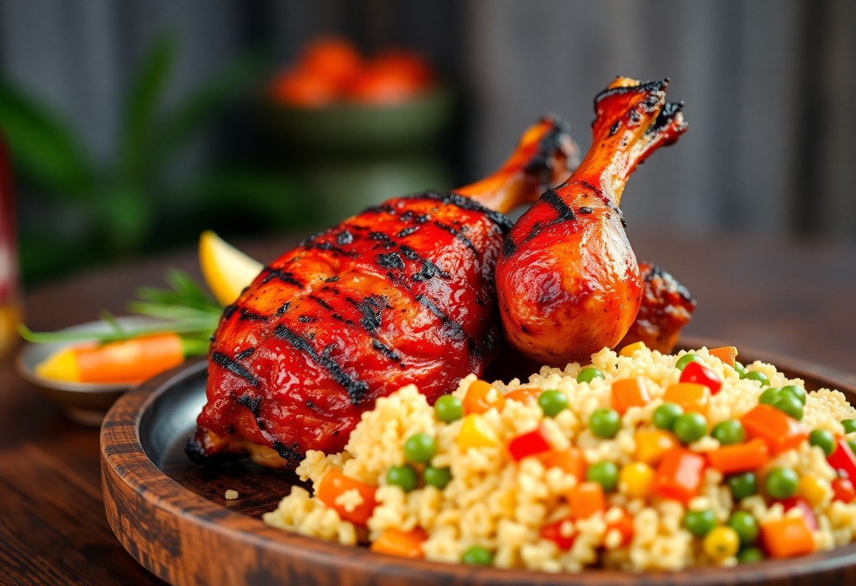 Your journey to crafting an authentic Jamaican jerk chicken begins with the right combination of spices. The hallmark of jerk seasoning includes allspice, also known as pimento, which lends a warm, aromatic flavor. Along with allspice, you’ll want to incorporate thyme, scotch bonnet peppers for heat, ginger for zing, and garlic for depth. The marinade is usually rounded out with ingredients like soy sauce, lime juice, and brown sugar, creating that perfect balance of sweet, sour, and spicy. Each element plays a vital role in achieving the warm, smoky complexity that defines authentic jerk chicken.
